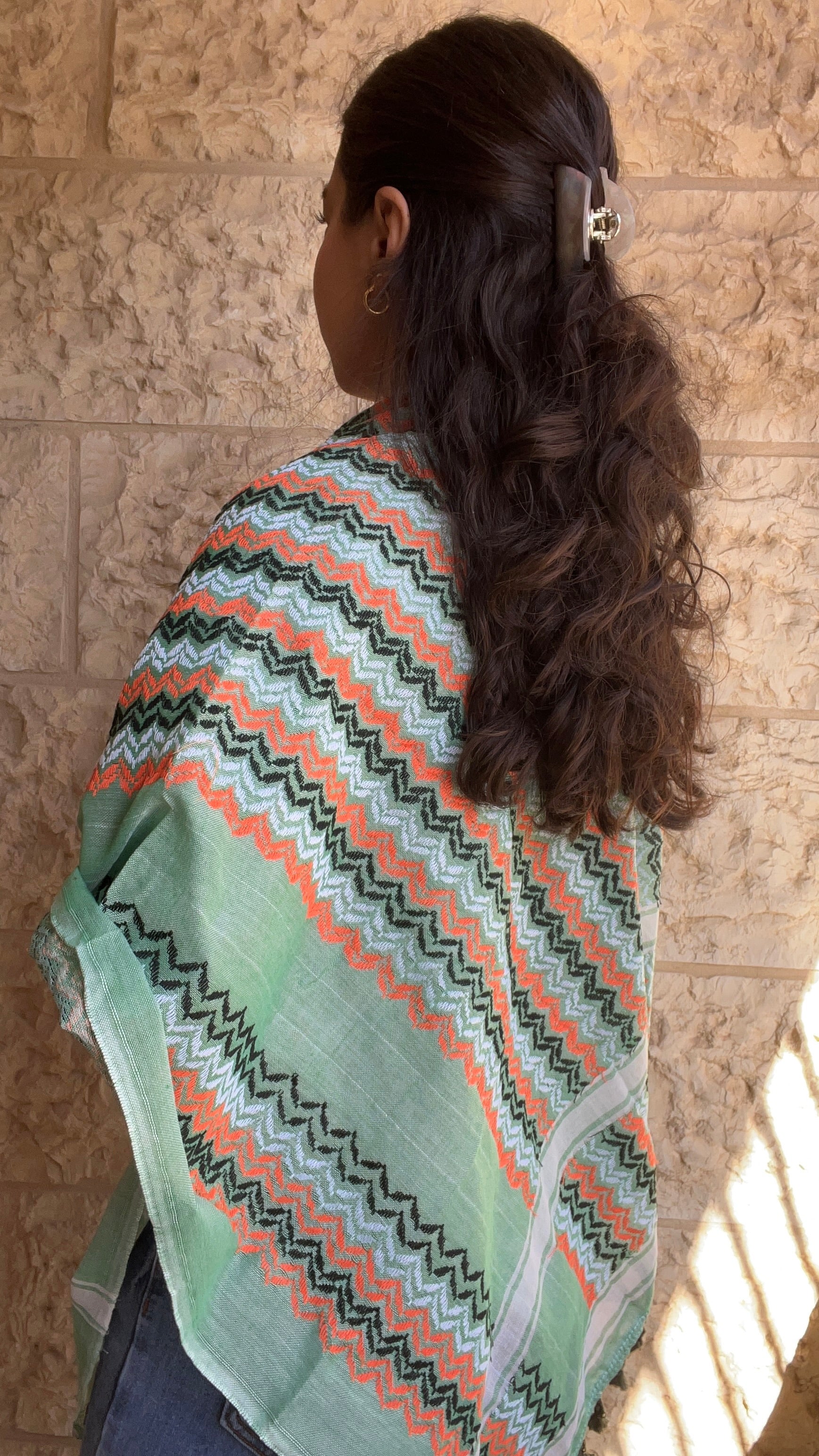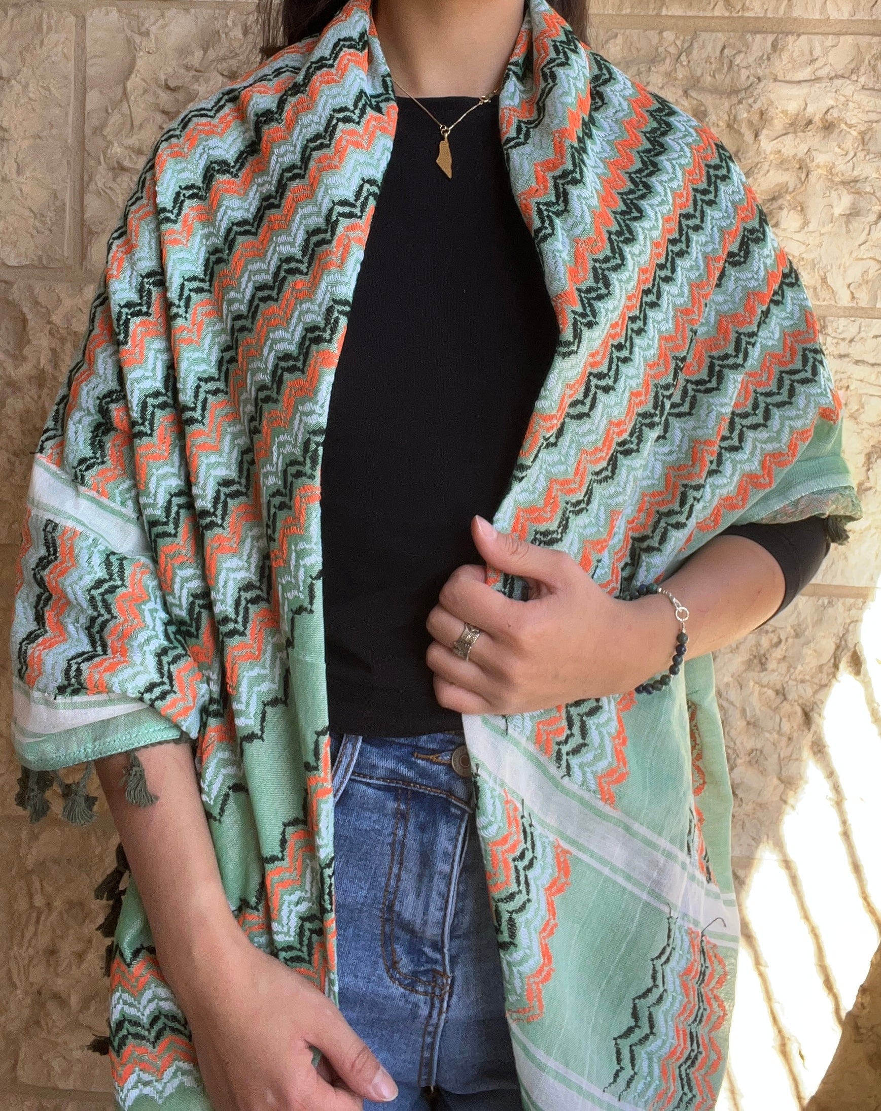 The kufiya’s pattern reflects the deep bond Palestinians have with their land. Its embroidery features three symbolic elements: