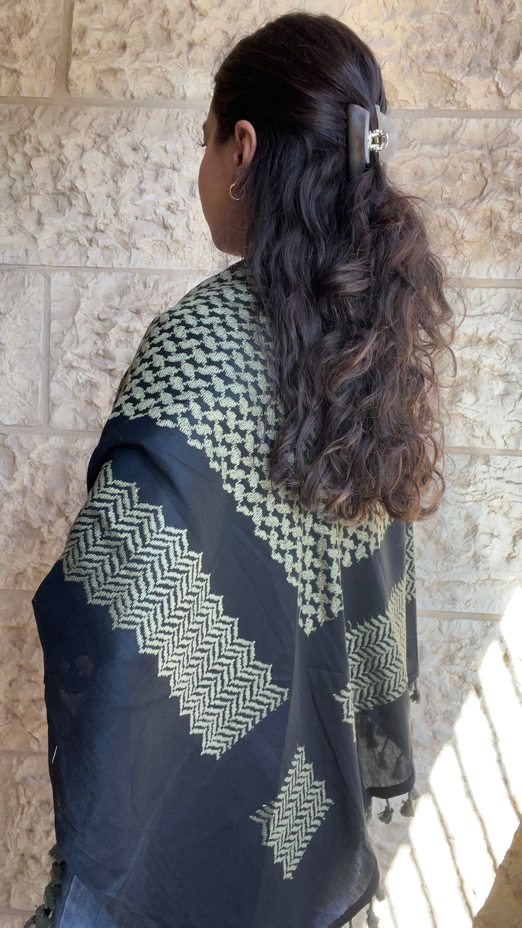 The kufiya’s pattern reflects the deep bond Palestinians have with their land. Its embroidery features three symbolic elements: